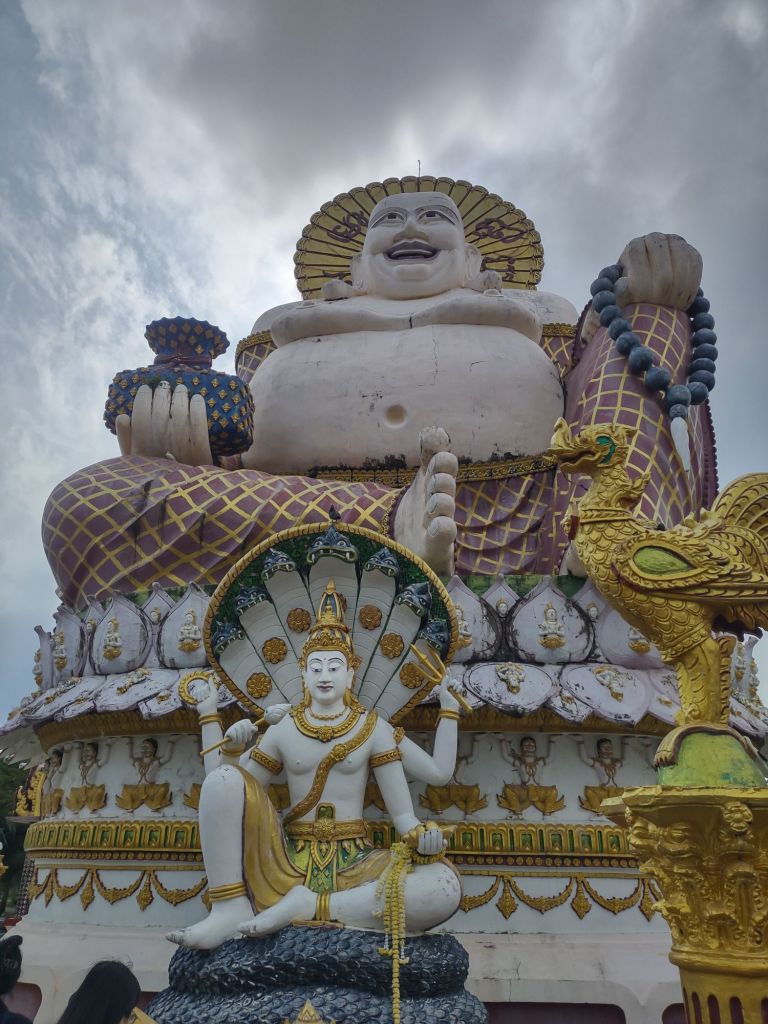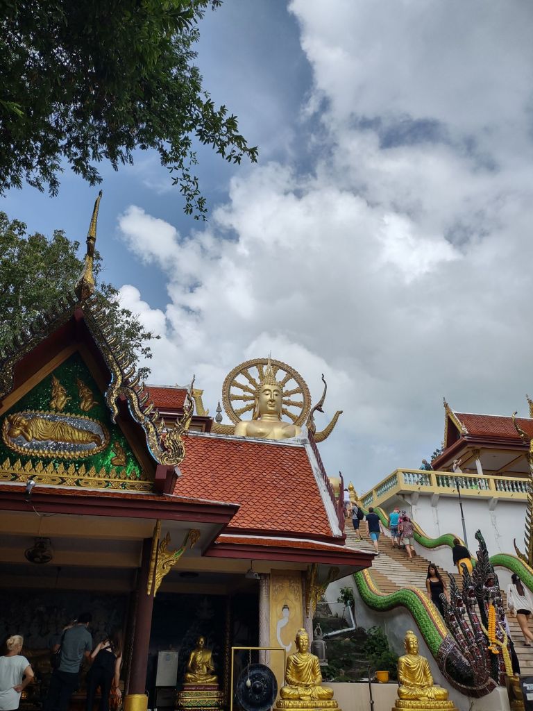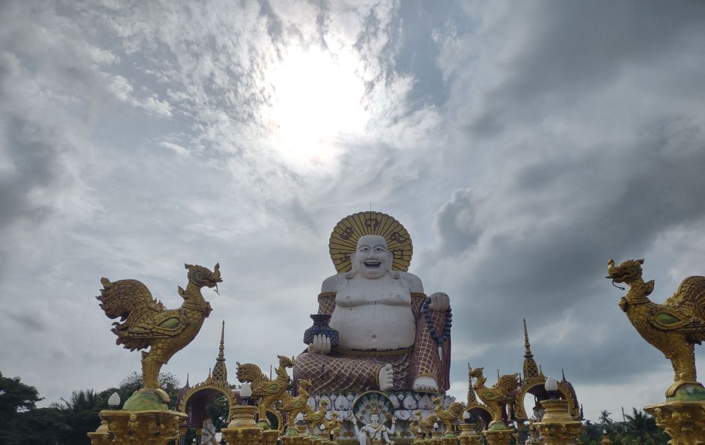 Across the site there are two monumental statues. A rather cheery Buddha looks out over the visiting throng, chuckling away as if he’s also enjoying a carefree beach holiday on Ko Samui