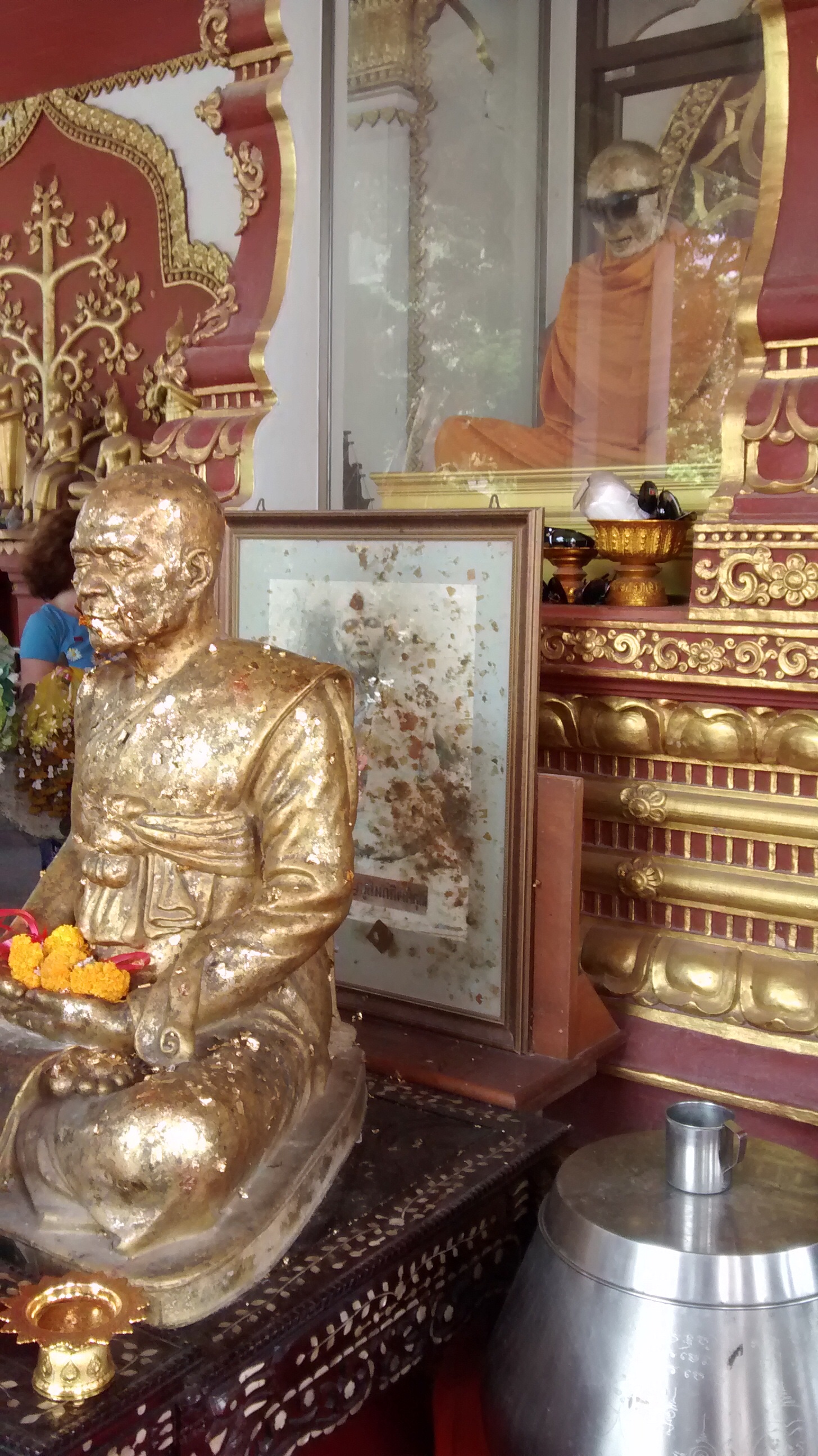 Buddhists are usually cremated, but Luang Pho Daeng stipulated that his body be kept on display in a seated position after his death (which apparently he also predicted). And lo! and behold, his body has somehow been mummified and has remained un-decomposed in that glass case for going on for half a century.