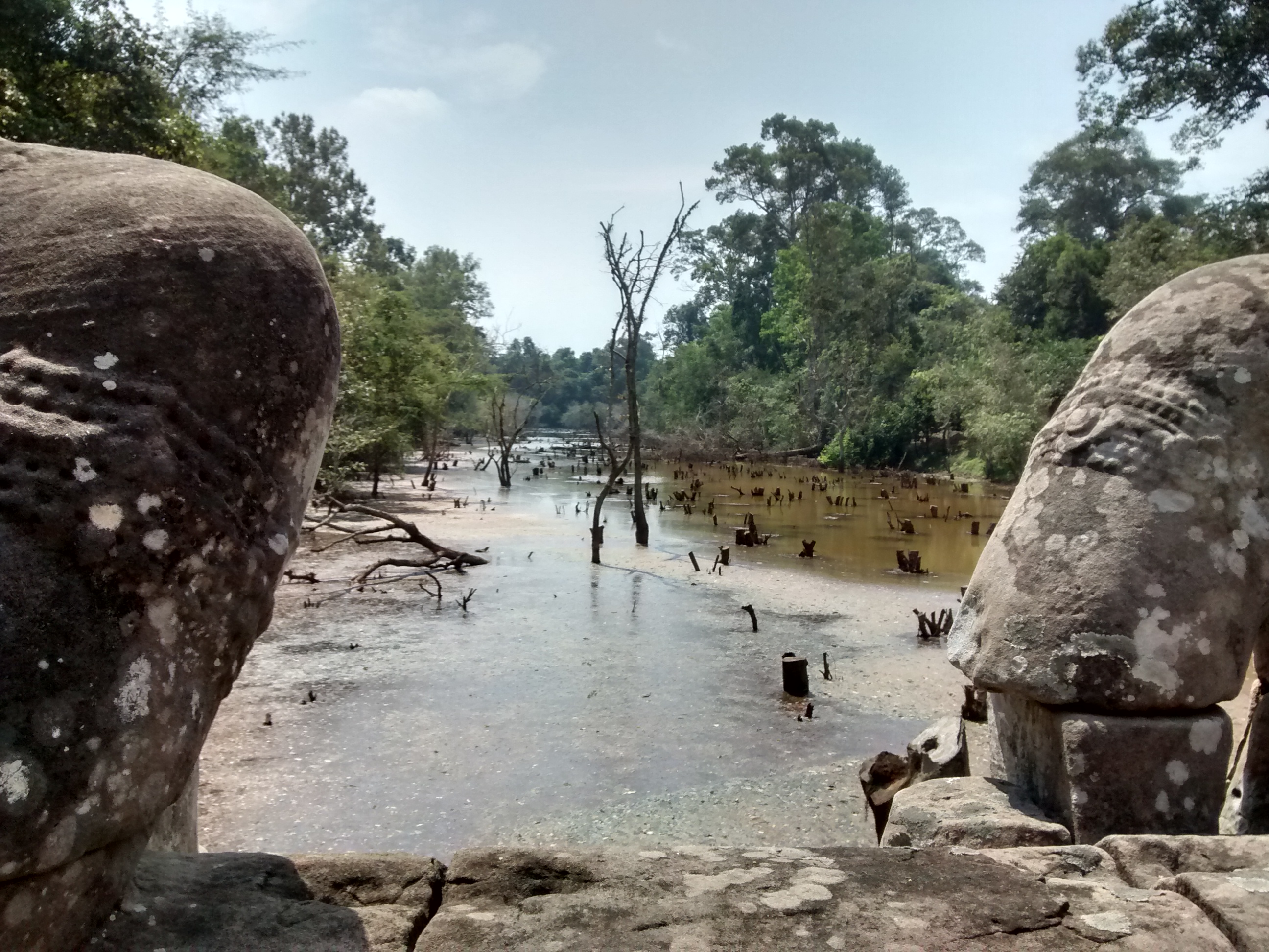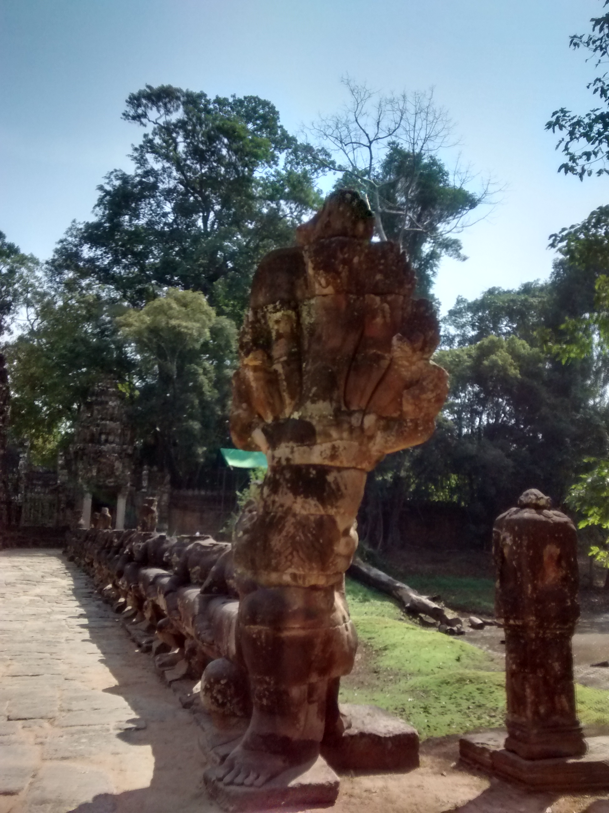Better leave then. Out through the east gate, and after we run the gauntlet of the poor young trinket sellers on the long dusty path out (I couldn’t shake mine off so I bought two “silk” scarves for $3) we reach the other causeway, more nagas and tug-of-war, and the serenely flowing moat.