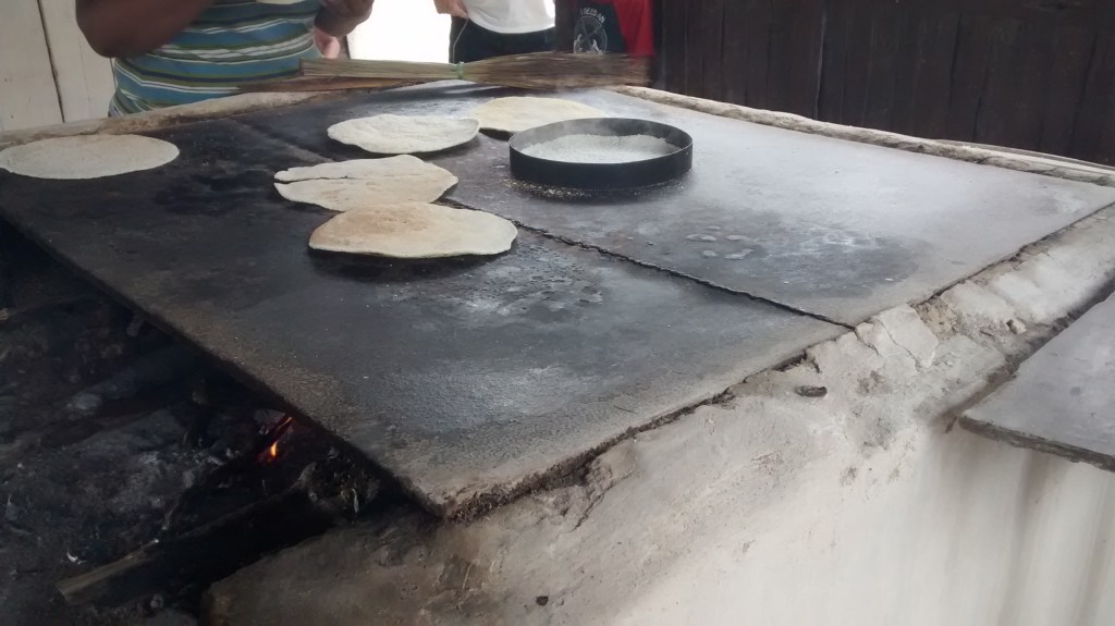 You grind the roots of the yuca plant, take the powder and smear it over the hot fire, turn it over, and you have cassava bread, a starchy relative of the poppadom, maybe more like a crisp pitta, a starchy crisp pitta.