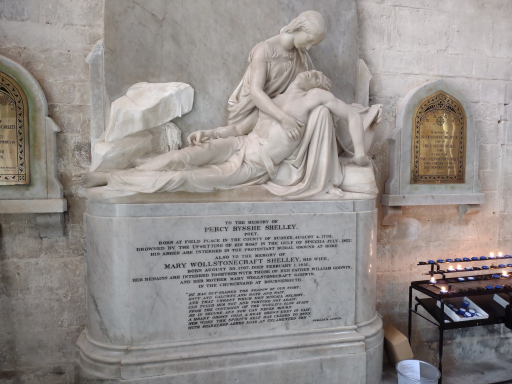 Before we leave C and head back to our base in B one more example of Christchurch craftiness, as told to me by one of the attendants at the church (I haven’t corroborated it as it’s too good a yarn to falsify; blame him if this is all rubbish). At the west end of the Priory is an elaborate 19th-century memorial to a local husband and wife. Well the wife had links with Bournemouth, but the church there thought the memorial too showy for them. Christchurch said “we’ll have it” and into the priory walls it went.