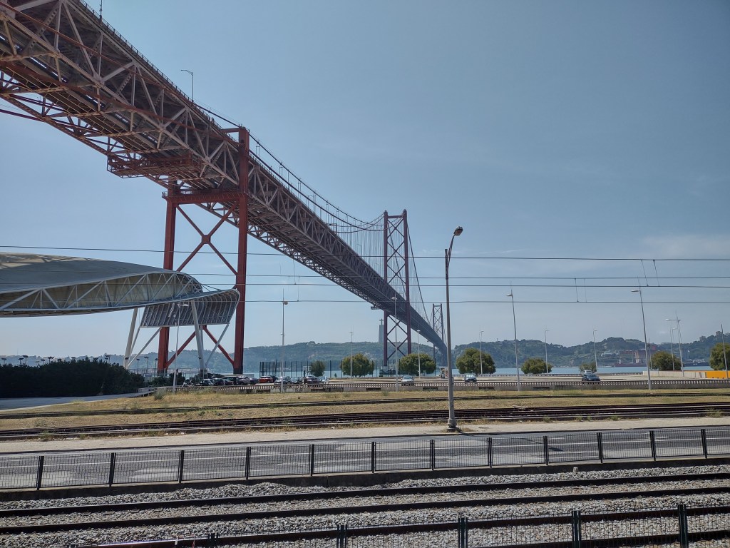 The graceful span of the Antonio Salazar suspension bridge across the Tagus, a few minutes from the Belem Tower and all that discovery glory.