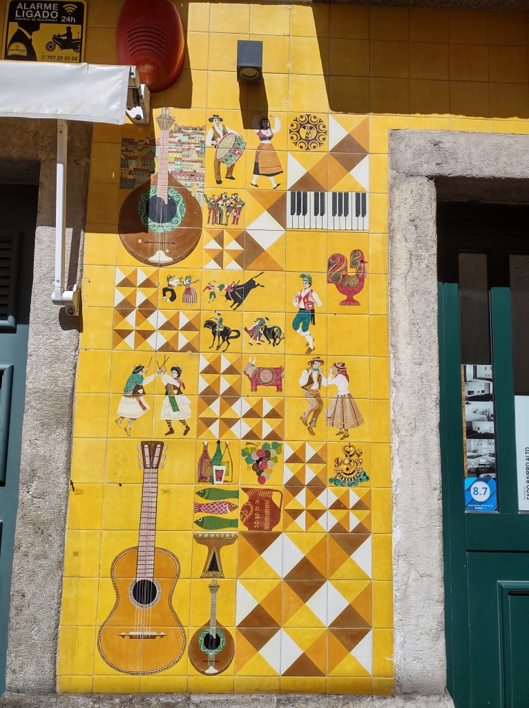The lively Barrio Alto area of central Lisbon (the western hilly bit) and a nice bit of artwork that neatly captures much of what characterises the country. Next to the guitar is Portugal’s own six strings, maybe some of the dancers are cavorting to its strains. They might be fisherfolk enjoying some well-deserved downtime after bringing in that catch of Lisbon’s famous sardines, out of which the garum, the fish oil much prized by the Romans, has been processed and poured into the urn. And the port wine has been flowing and it’s all going on, some bullfighting is happening too and do I hear the sombre tones of, fado?